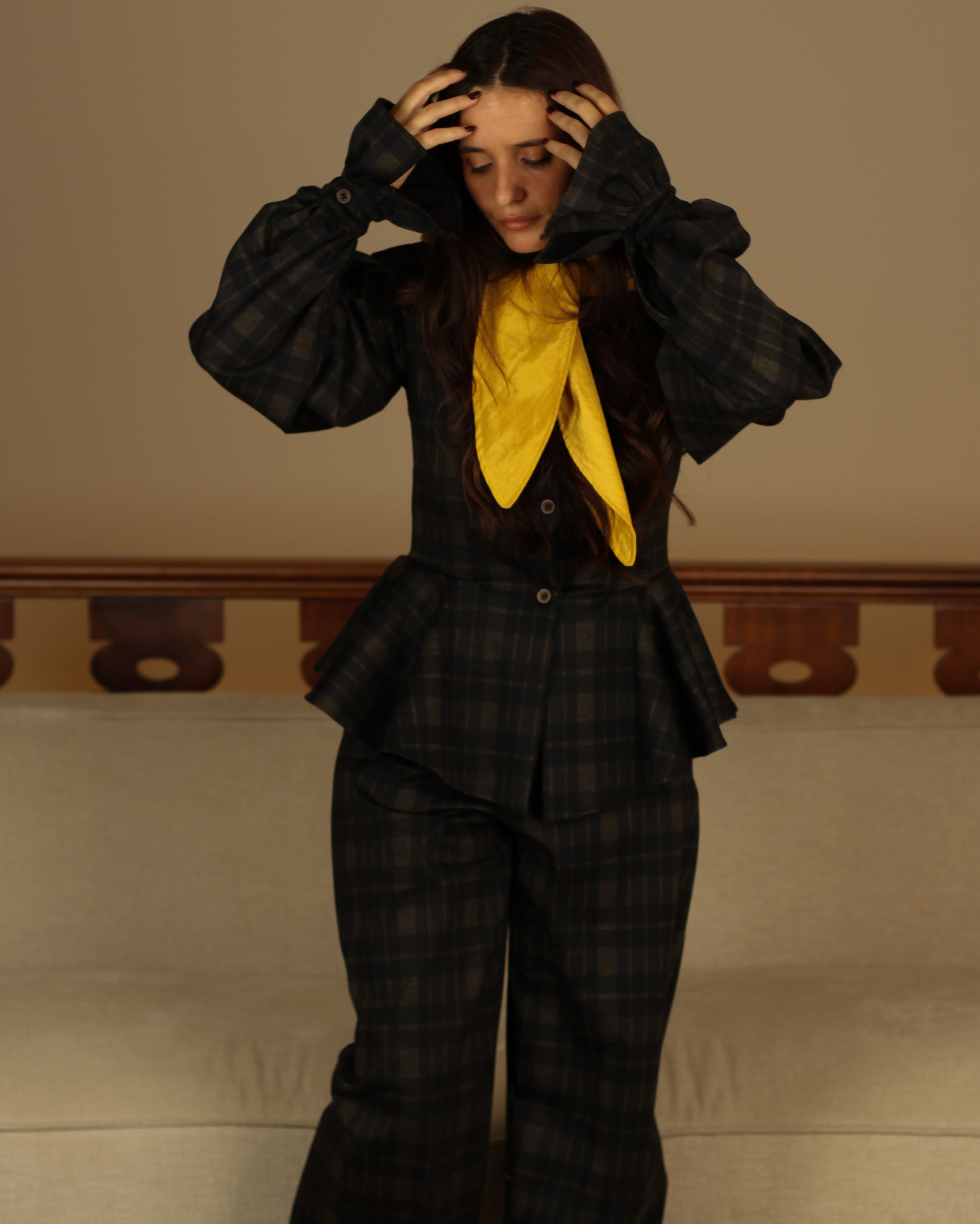 Blusa/ Casaco de decote redondo e capuz amovível em contraste. Manga comprida abalonada com punho em folho. Fecho frontal de botões na frente. Detalhe de folho em evasé.