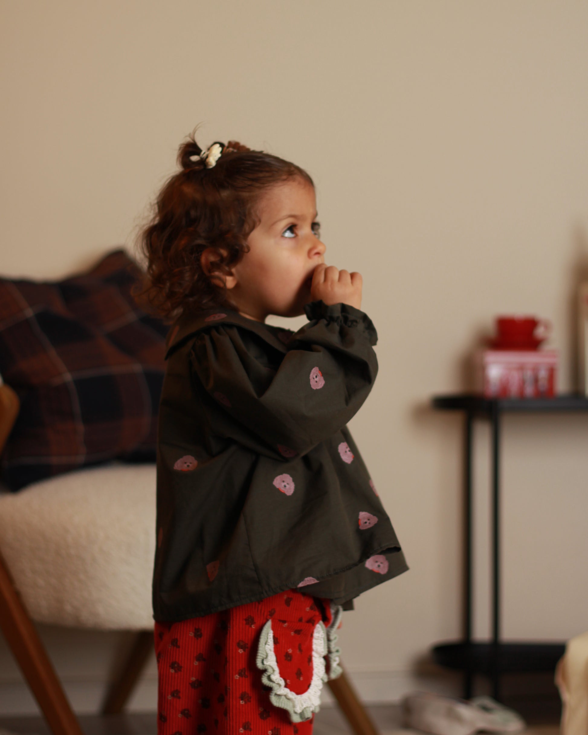 Blusa de decote redondo e gola bébe, manga comprida com punho elástico que termina em folho. Pormenor de estampado. Fecho de botões á frente.