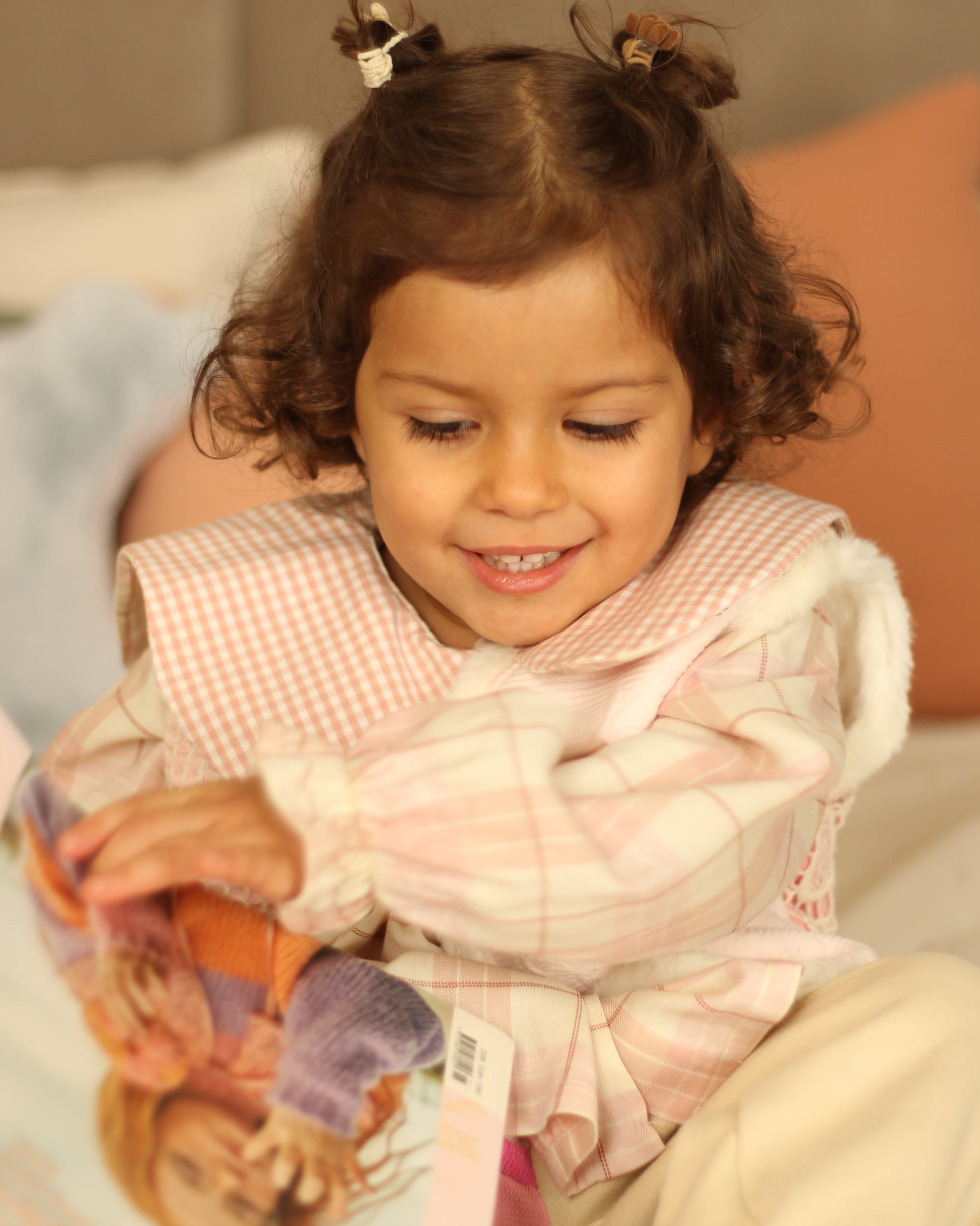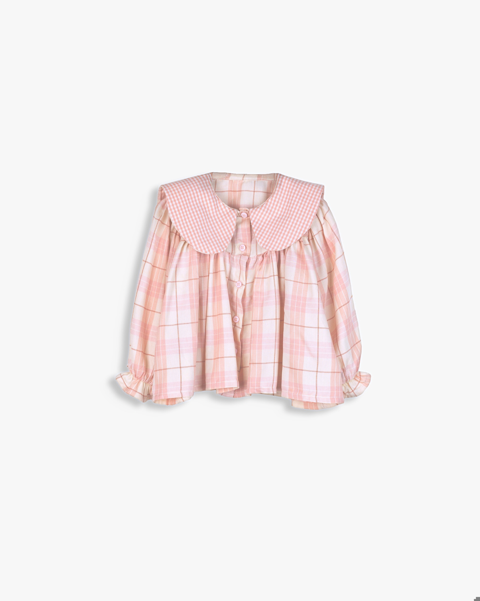 Blusa de decote redondo e gola bébe em contraste, manga comprida com punho elástico que termina em folho. Fecho de botões á frente.