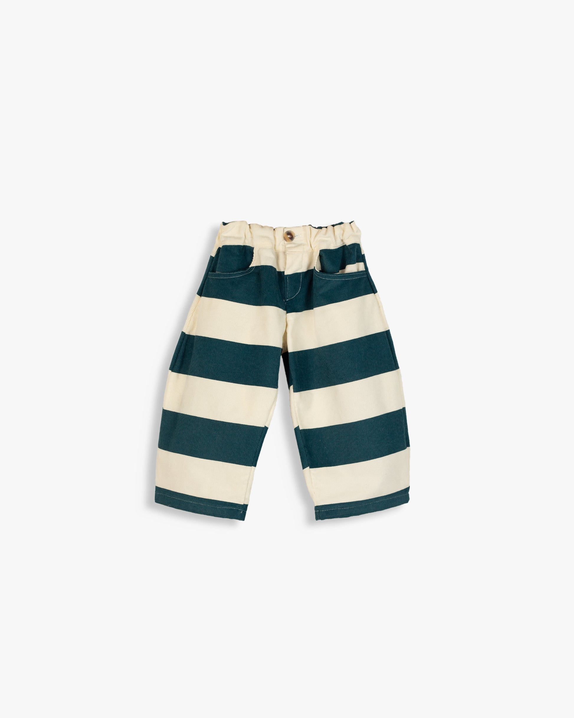 Calças em bombazina de cós elástico, bolsos na frente e fecho em botão.