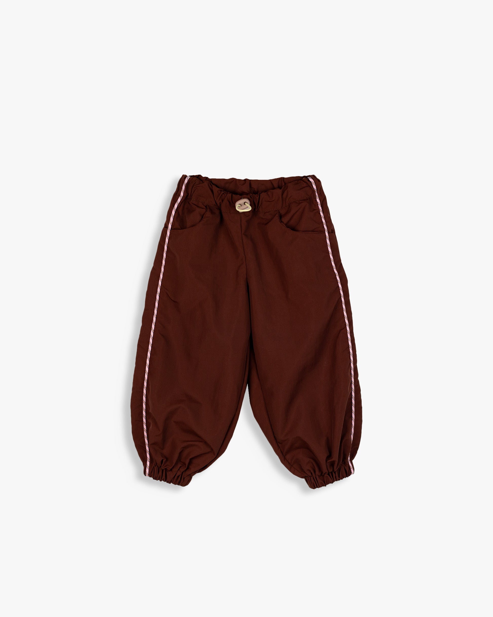 Calças de cós elástico com elástico ajustável em contraste. Estilo baggy com punho elástico. Detalhe na lateral com vivo de cor. Bolsos frontais.