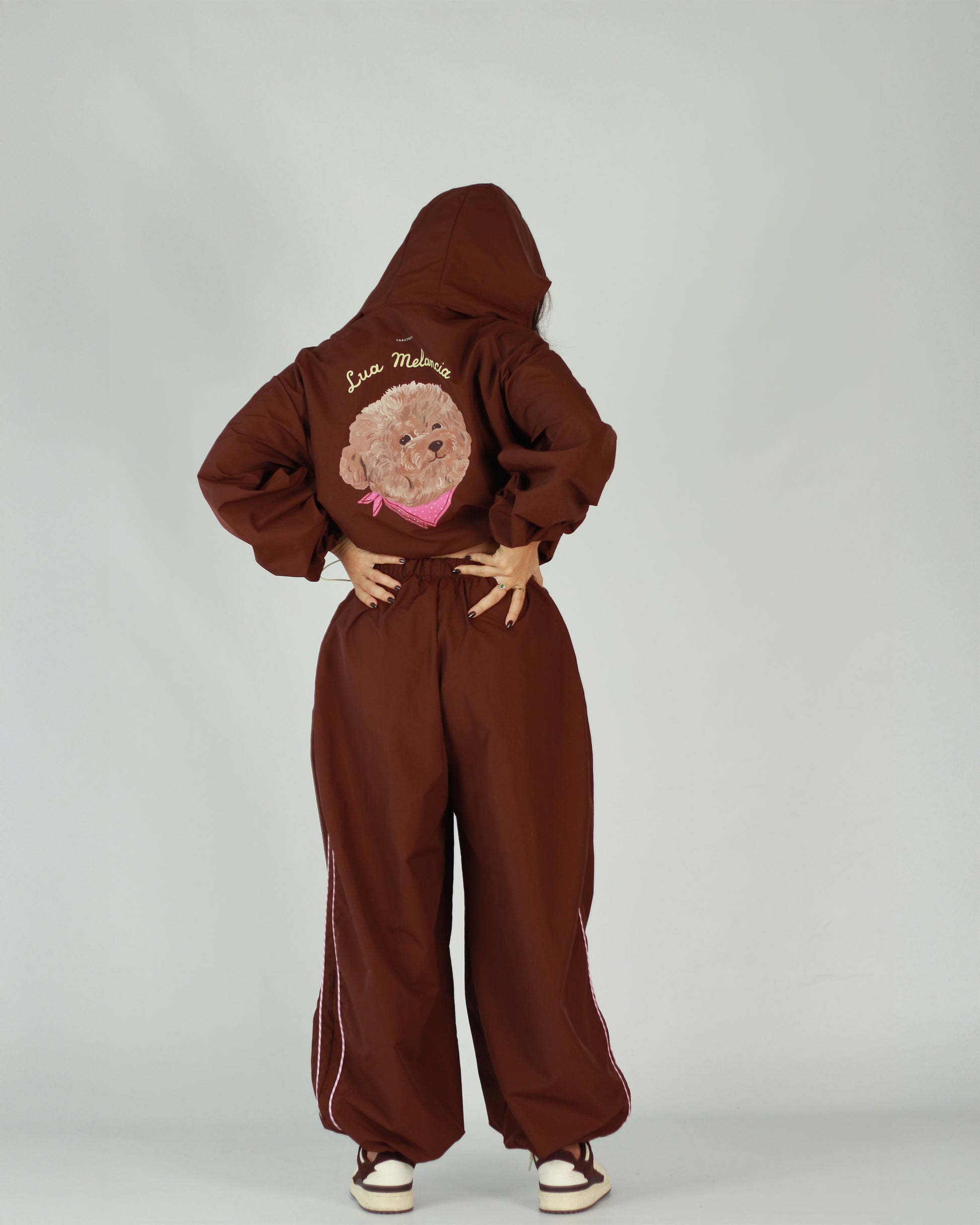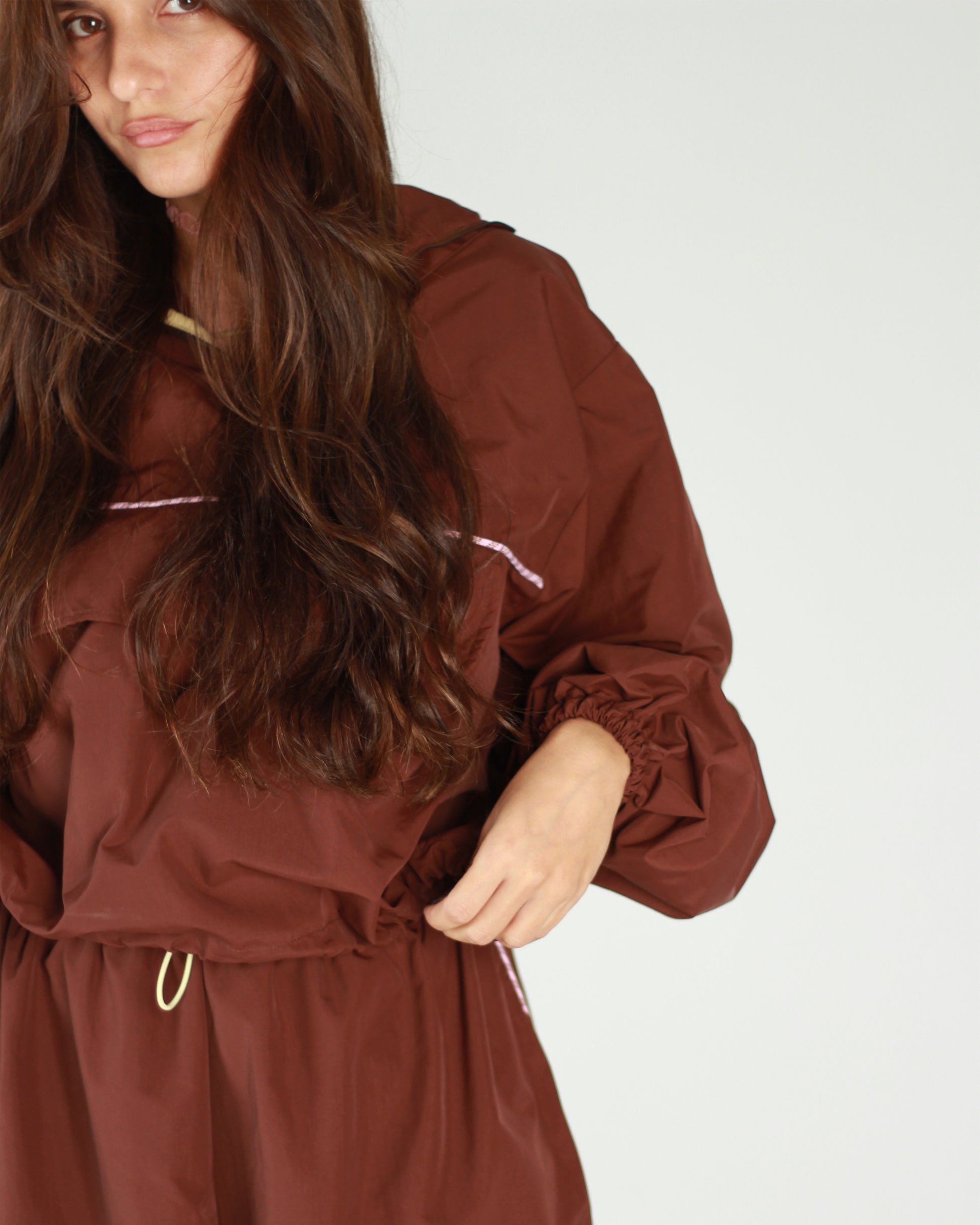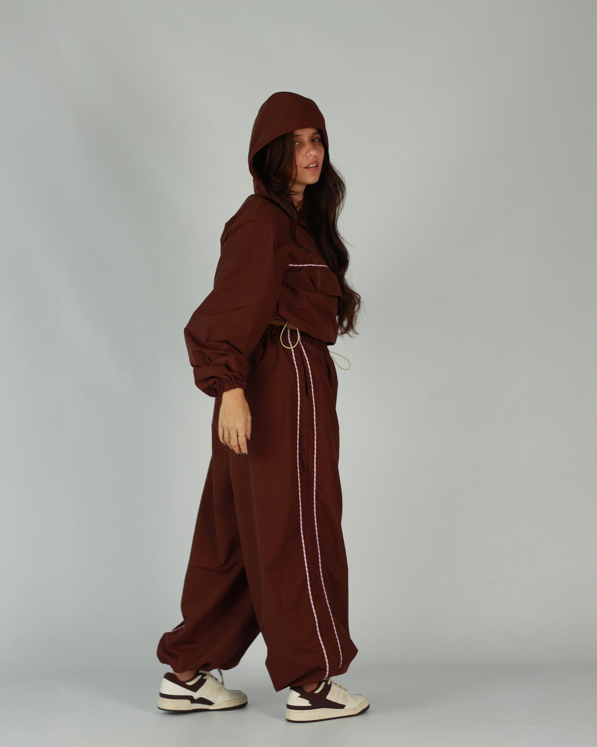 Calças de cós elástico com elástico ajustável em contraste. Estilo baggy com bainha elástica. Detalhe na lateral com vivo de cor. Bolsos na lateral.