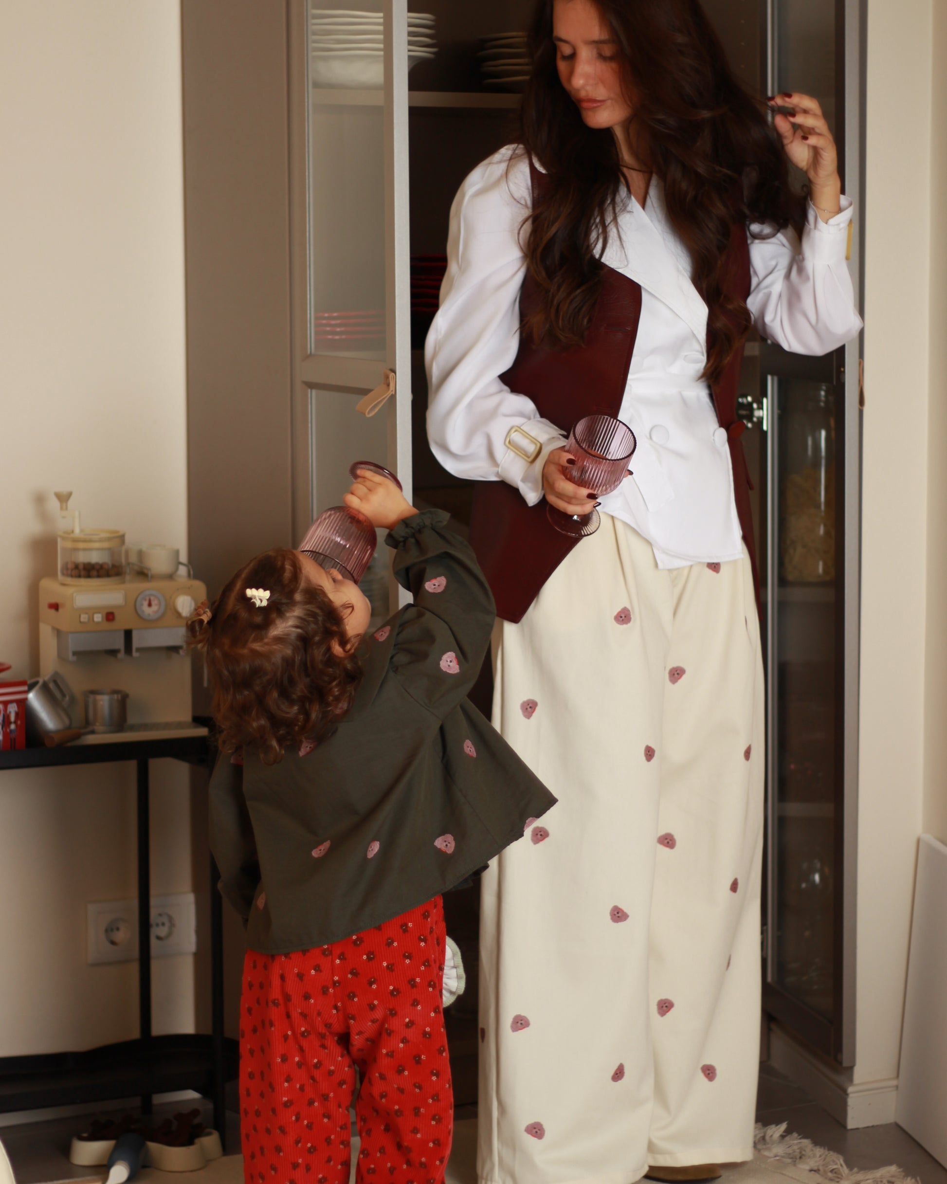Calças largas de cós elástico, bolsos na lateral e fecho em botão e zíper. Pormenor de pregas largas na frente.