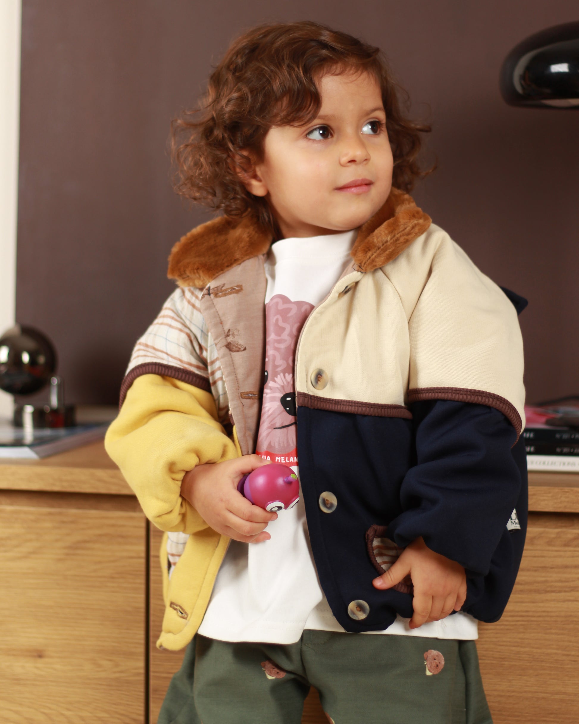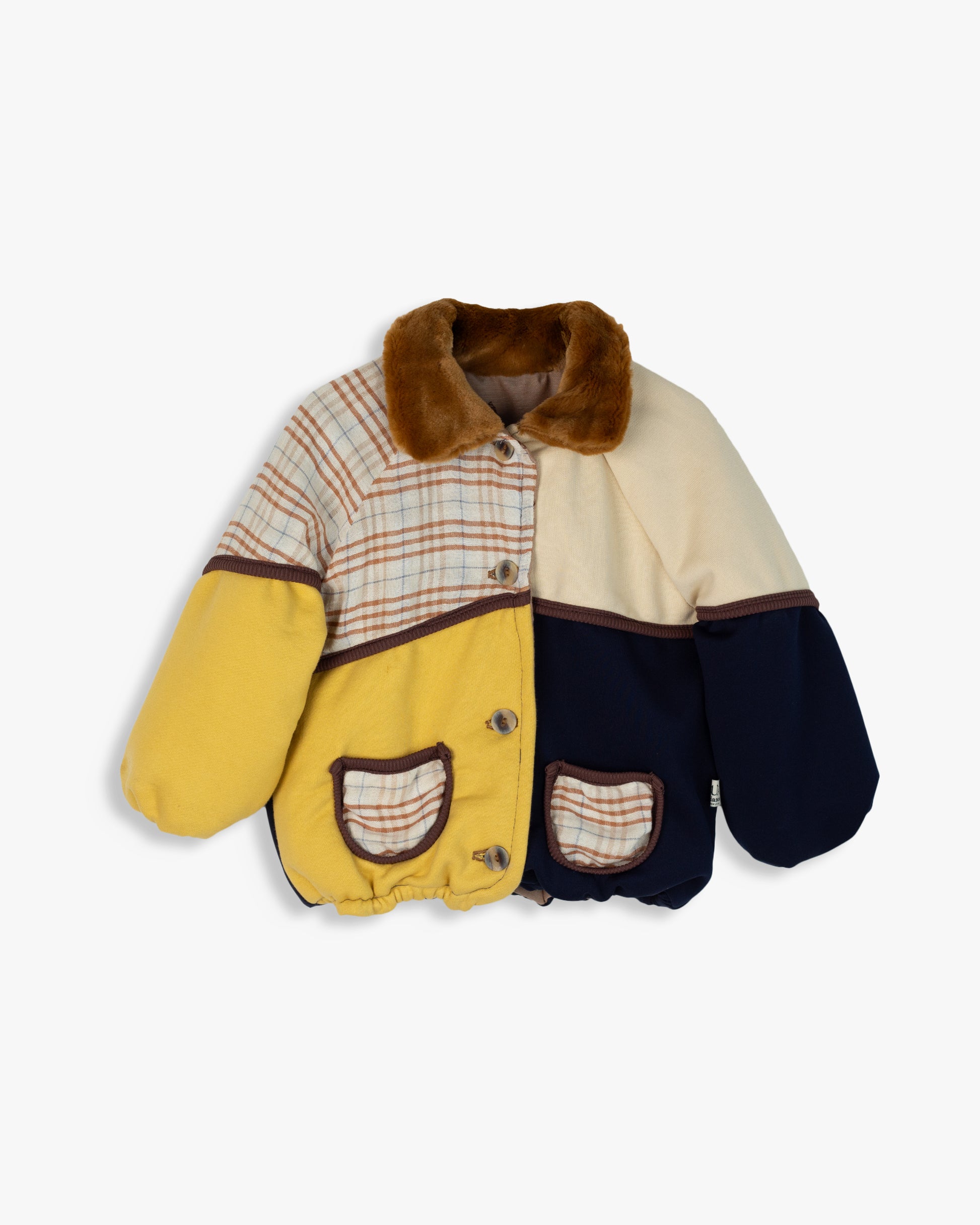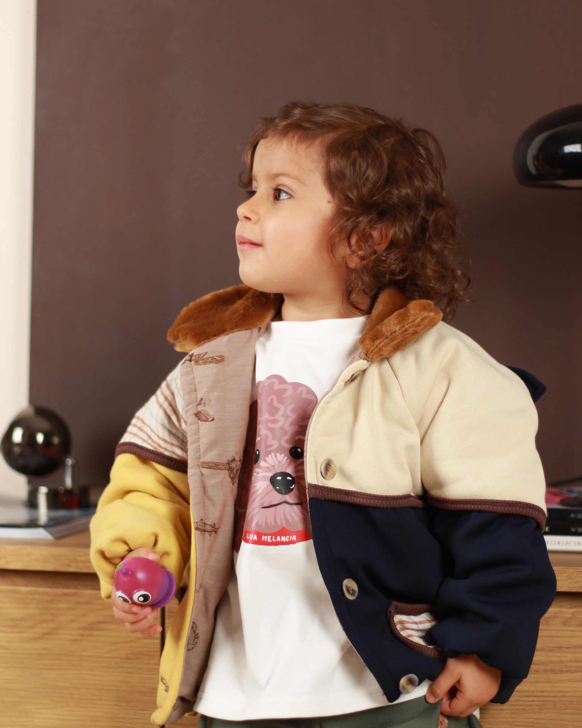 Casaco de decote redondo, gola de abas em pelo e manga comprida. Bolsos de chapa e viés. Fecho frontal com botões. Pormenor de bordado nas costas. Casaco interativo e sensorial, através de janela "abre e fecha", bordado com texturas.