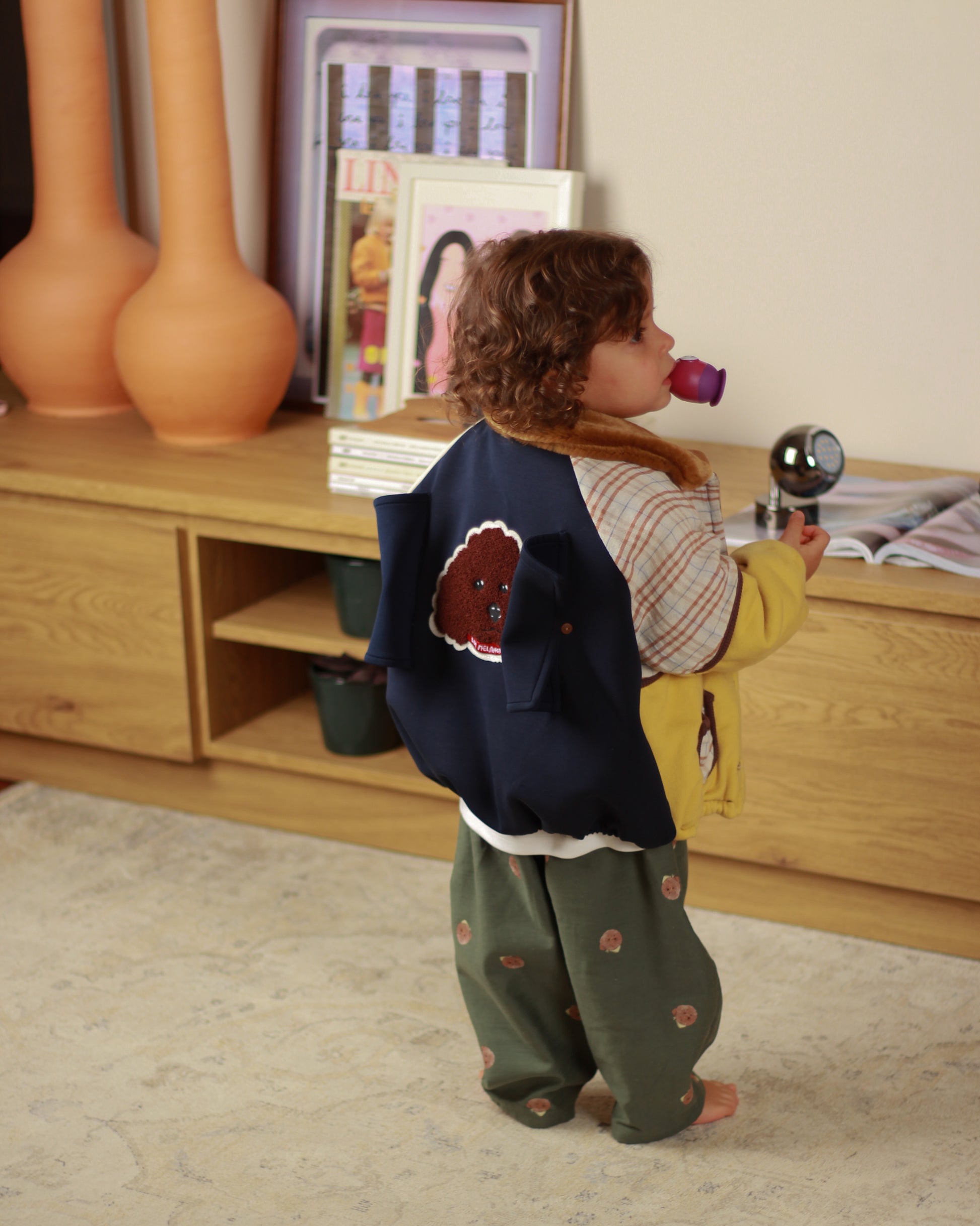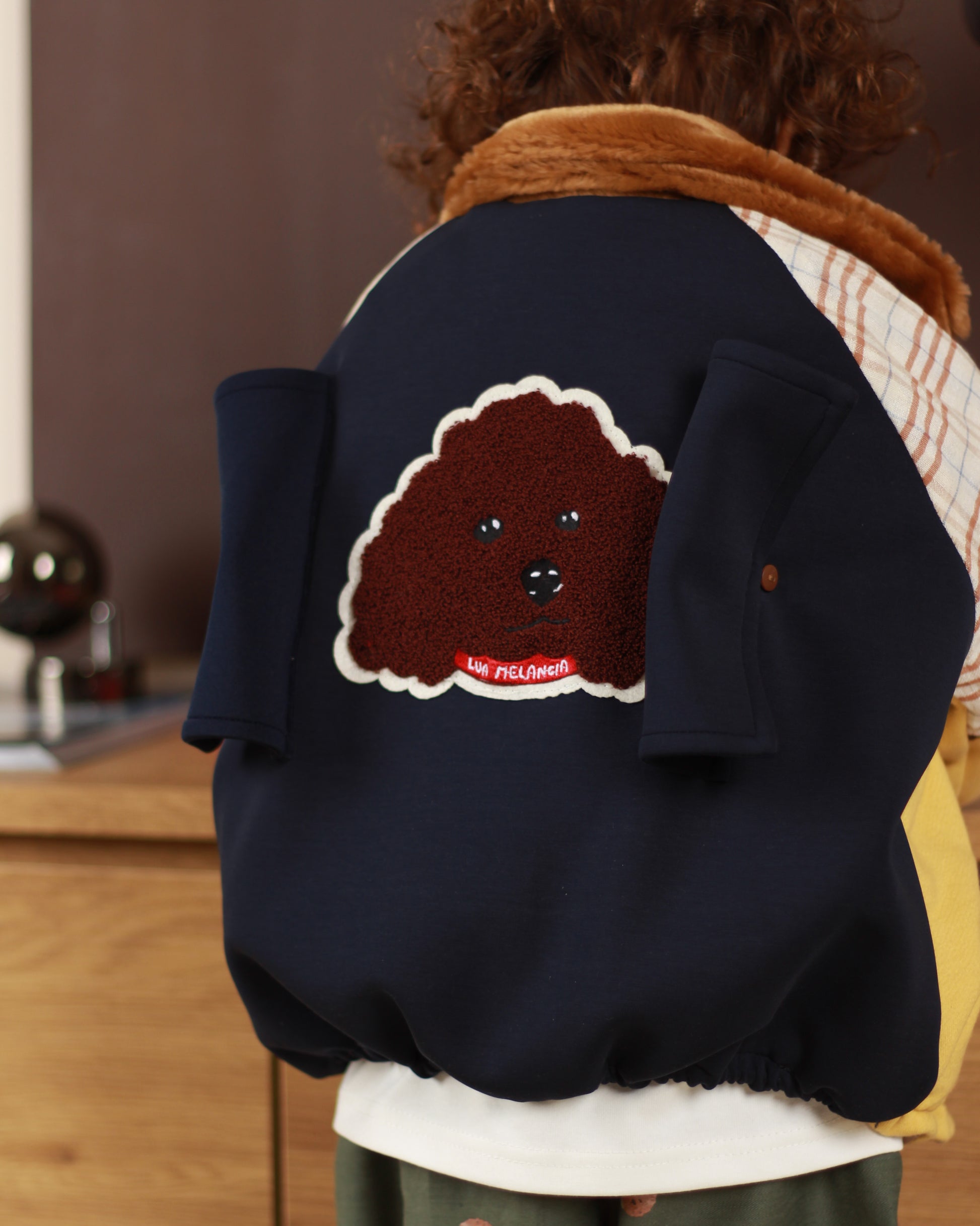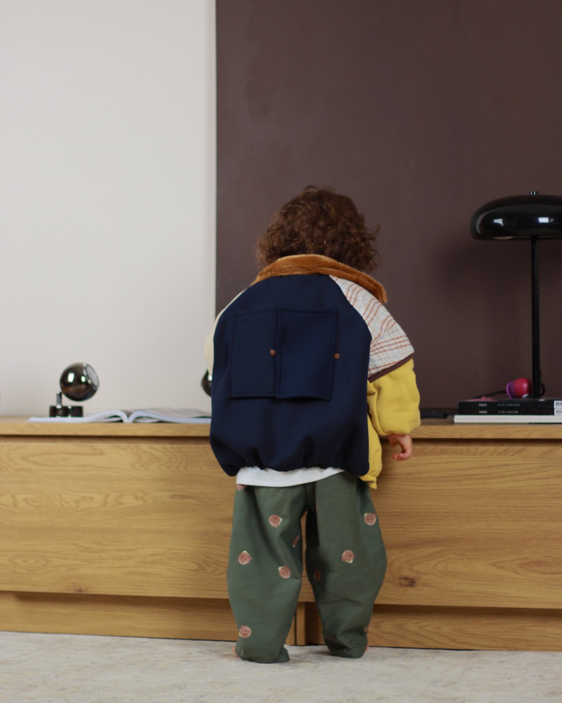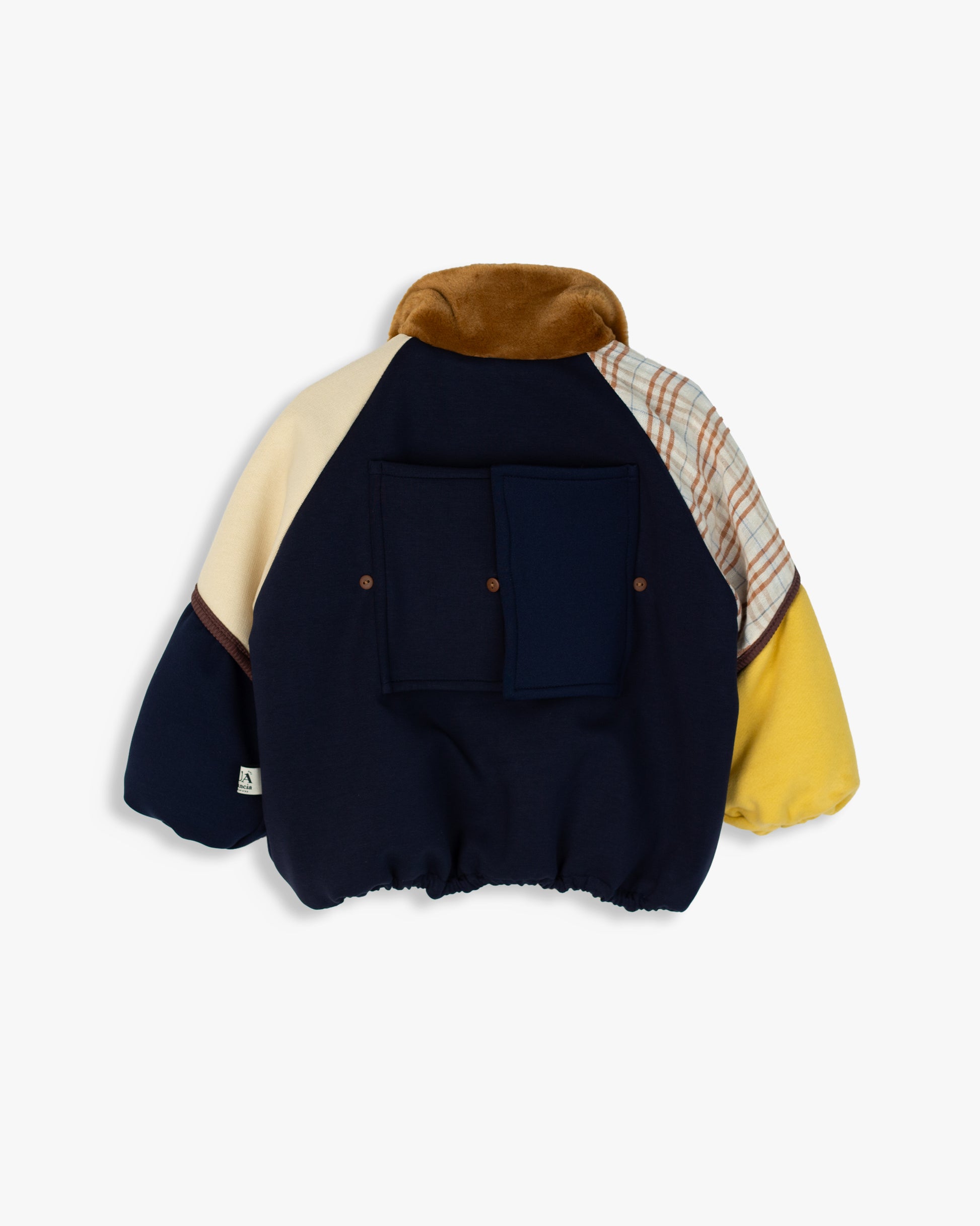 Casaco de decote redondo, gola de abas em pelo e manga comprida. Bolsos de chapa e viés. Fecho frontal com botões. Pormenor de bordado nas costas. Casaco interativo e sensorial, através de janela "abre e fecha", bordado com texturas.