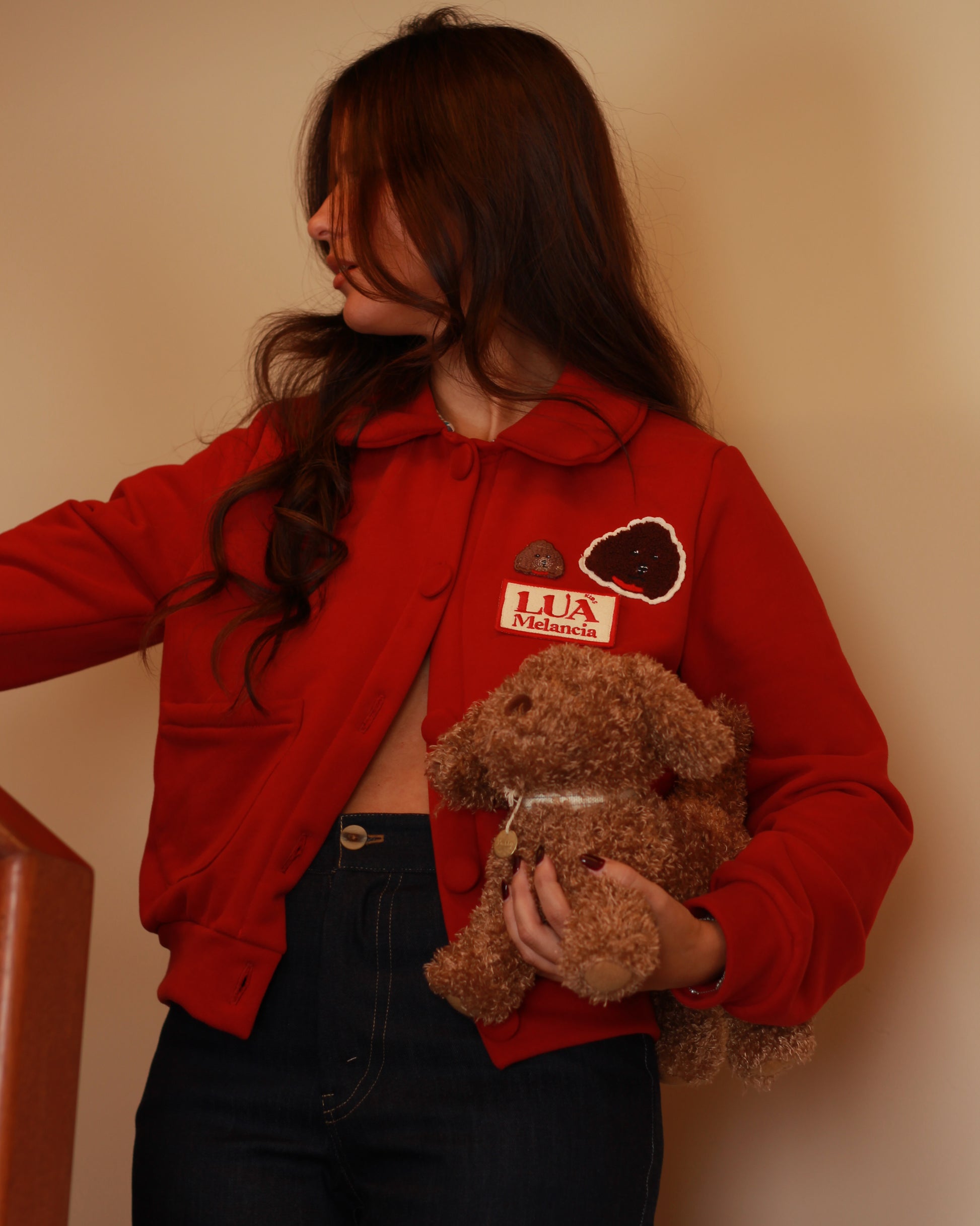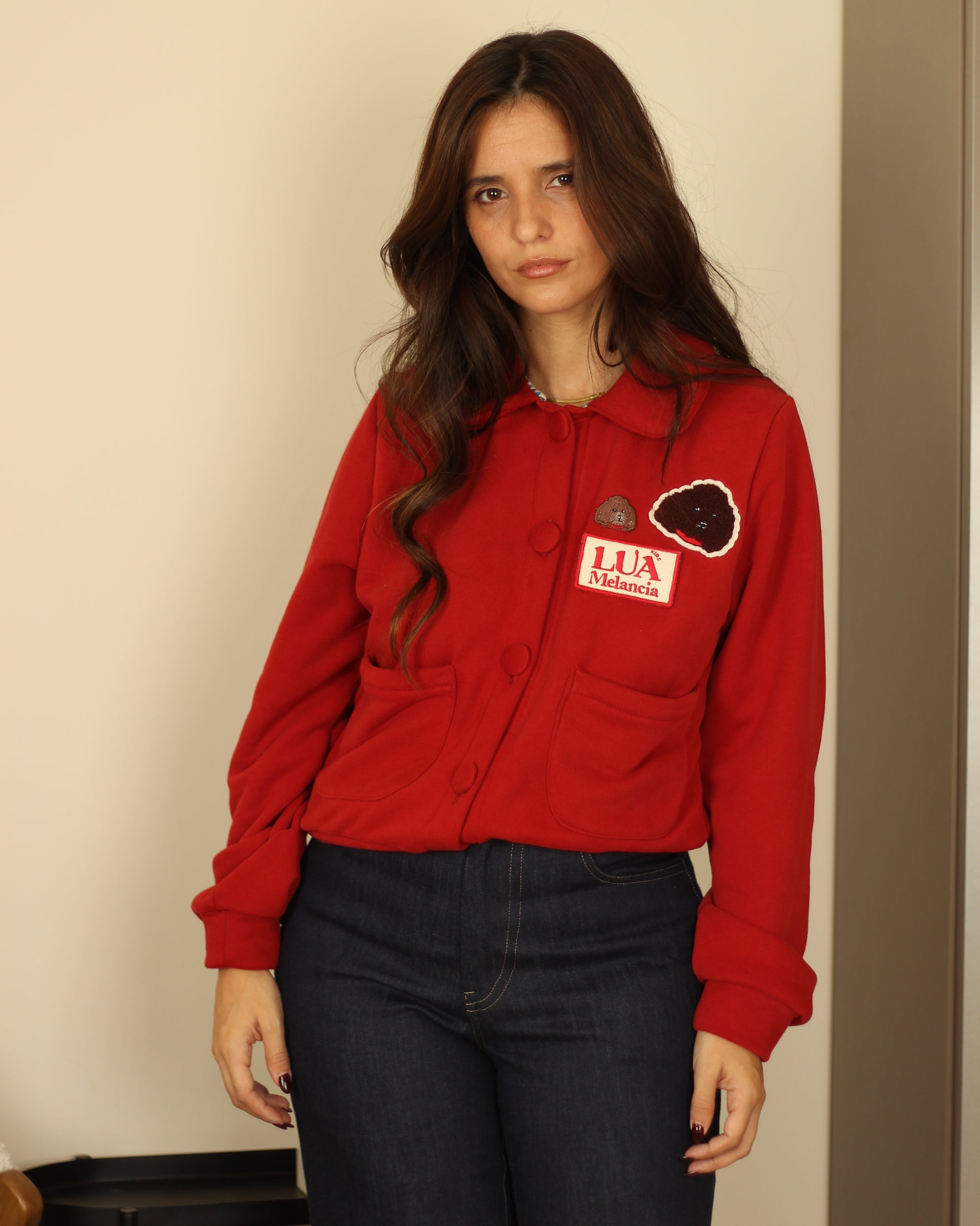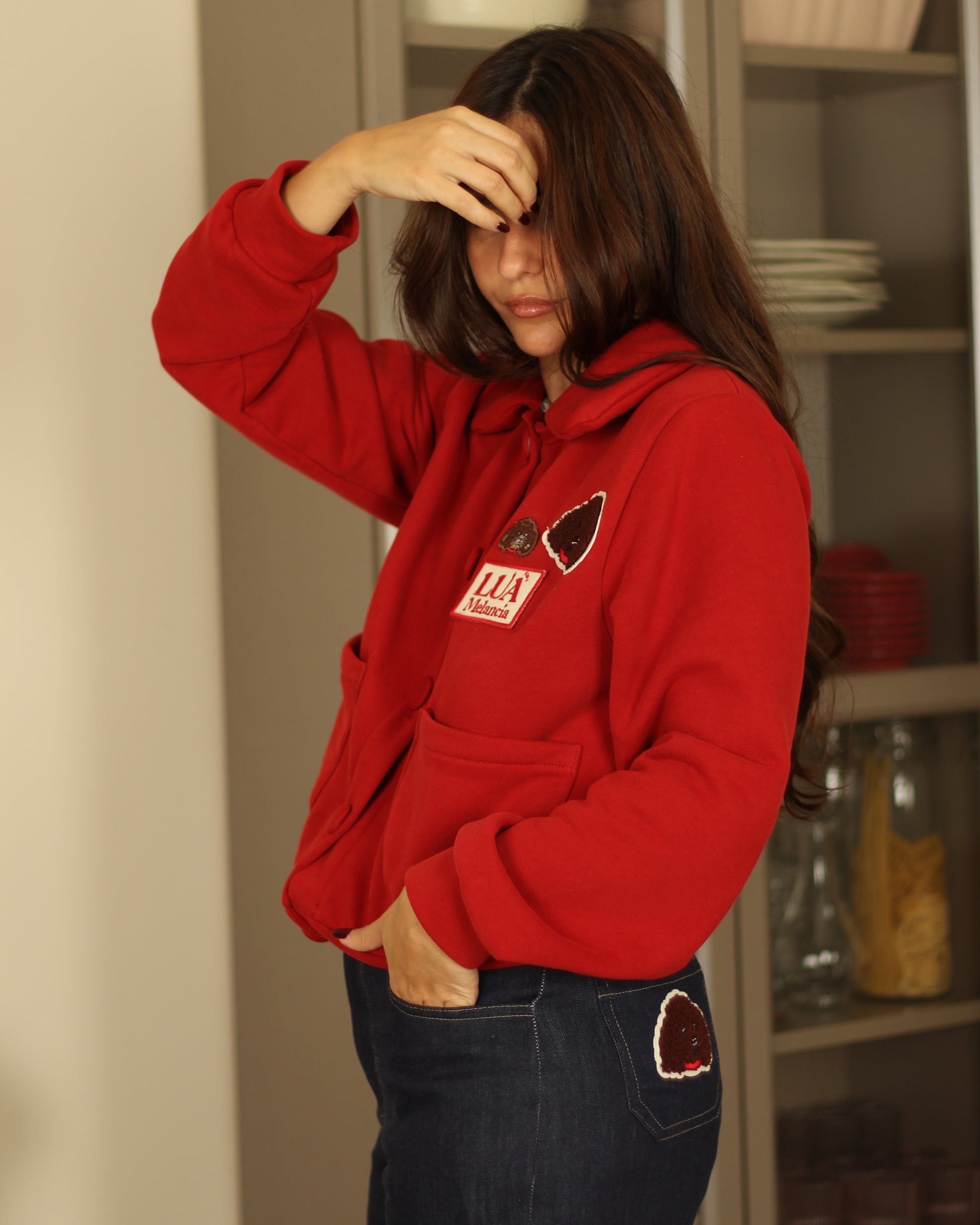 Casaco de decote redondo e gola de abas acolchoada. Manga comprida com punho. Fecho frontal com botões e bolsos de chapa. Pormenor de bordados na frente.