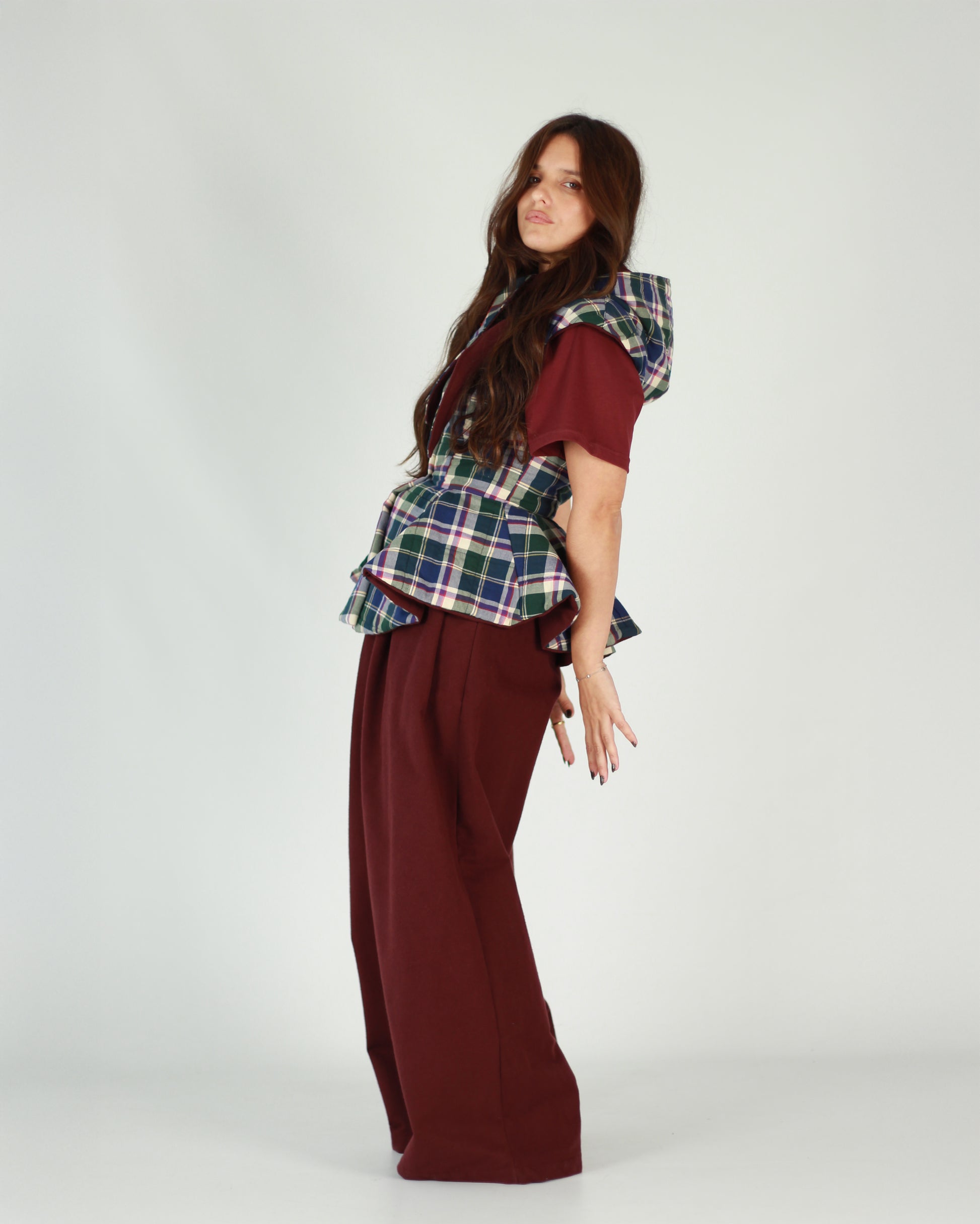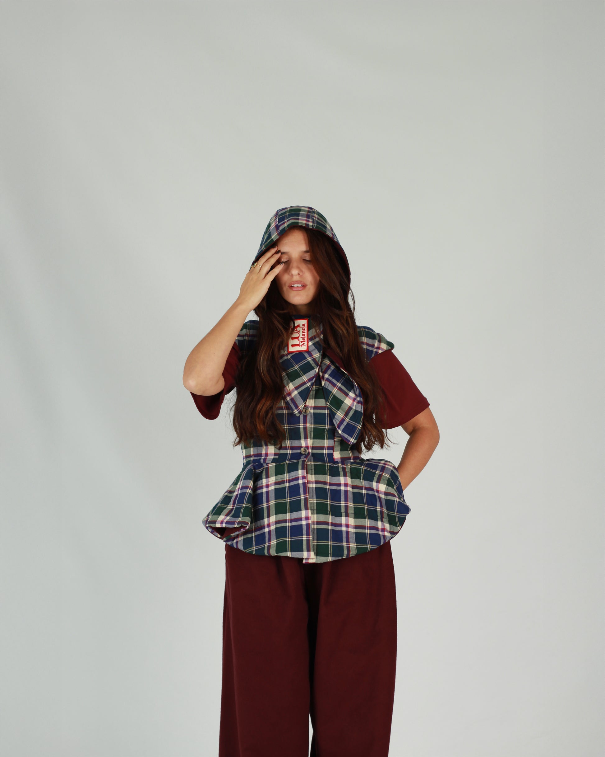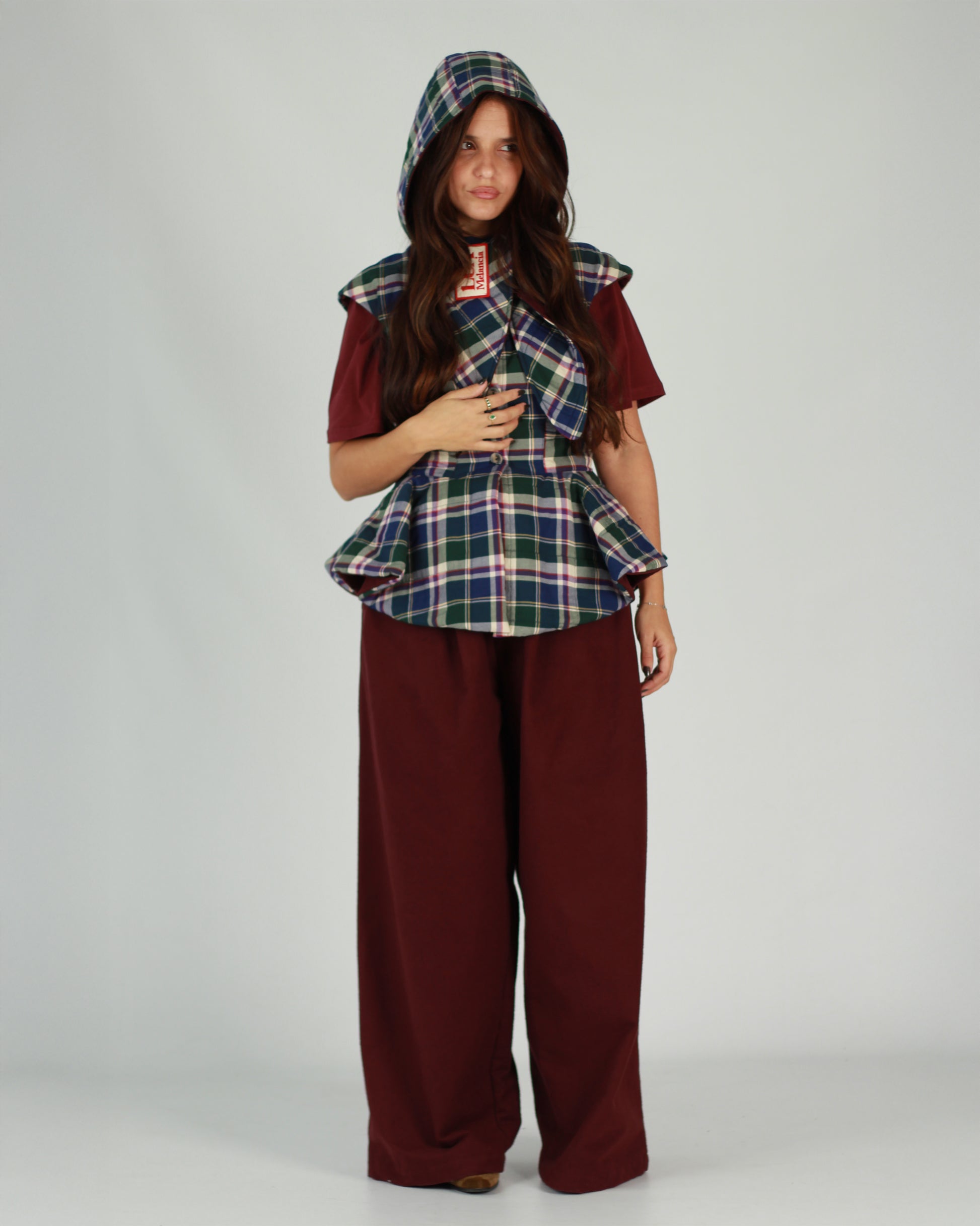Colete de decote redondo e capuz amovível. Manga cava. Fecho frontal de botões na frente. Detalhe de folho em evasé. Colete forrado.