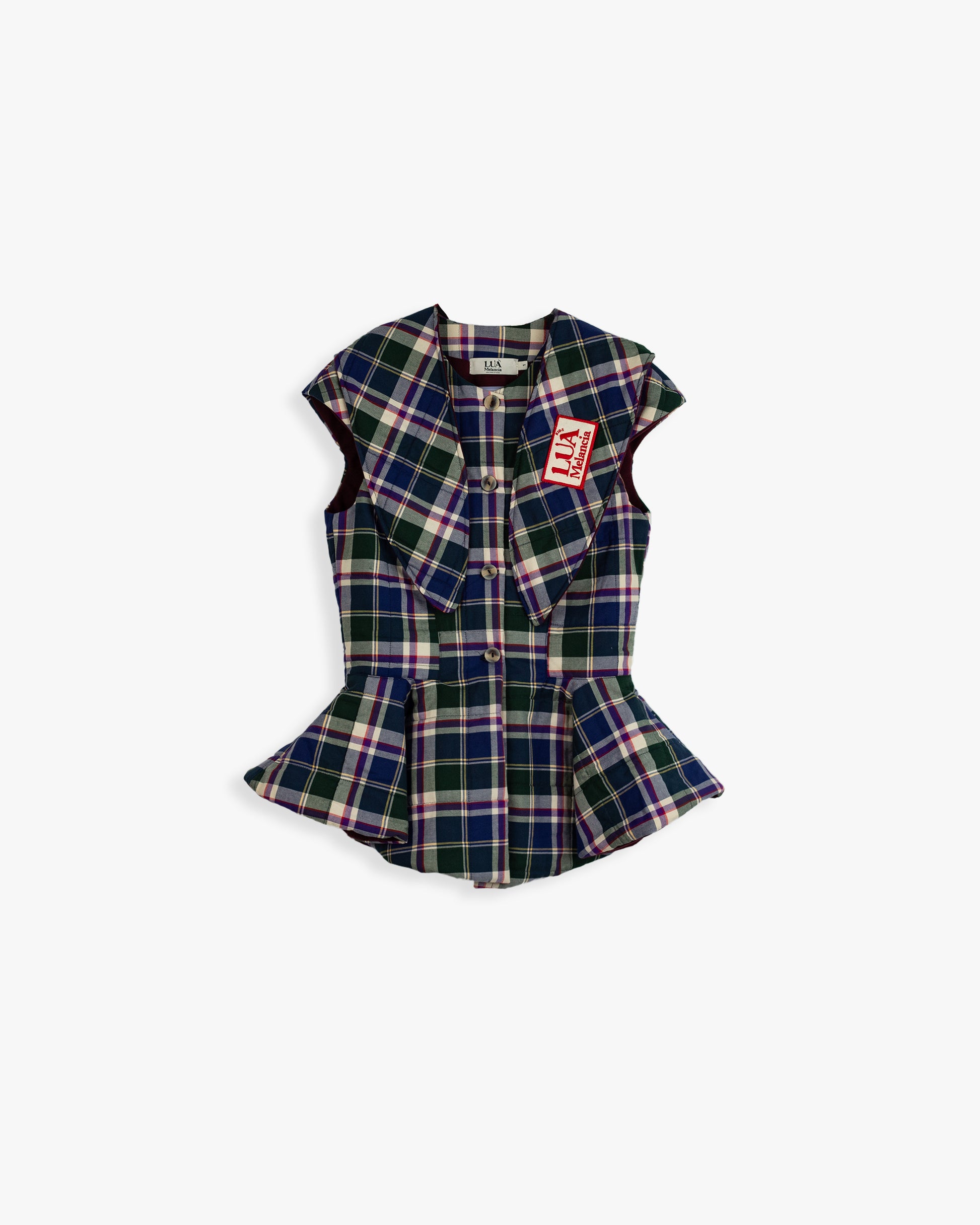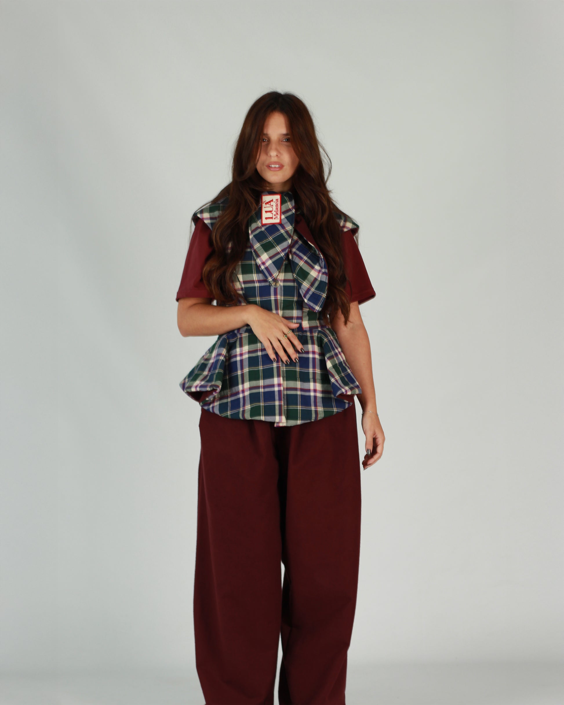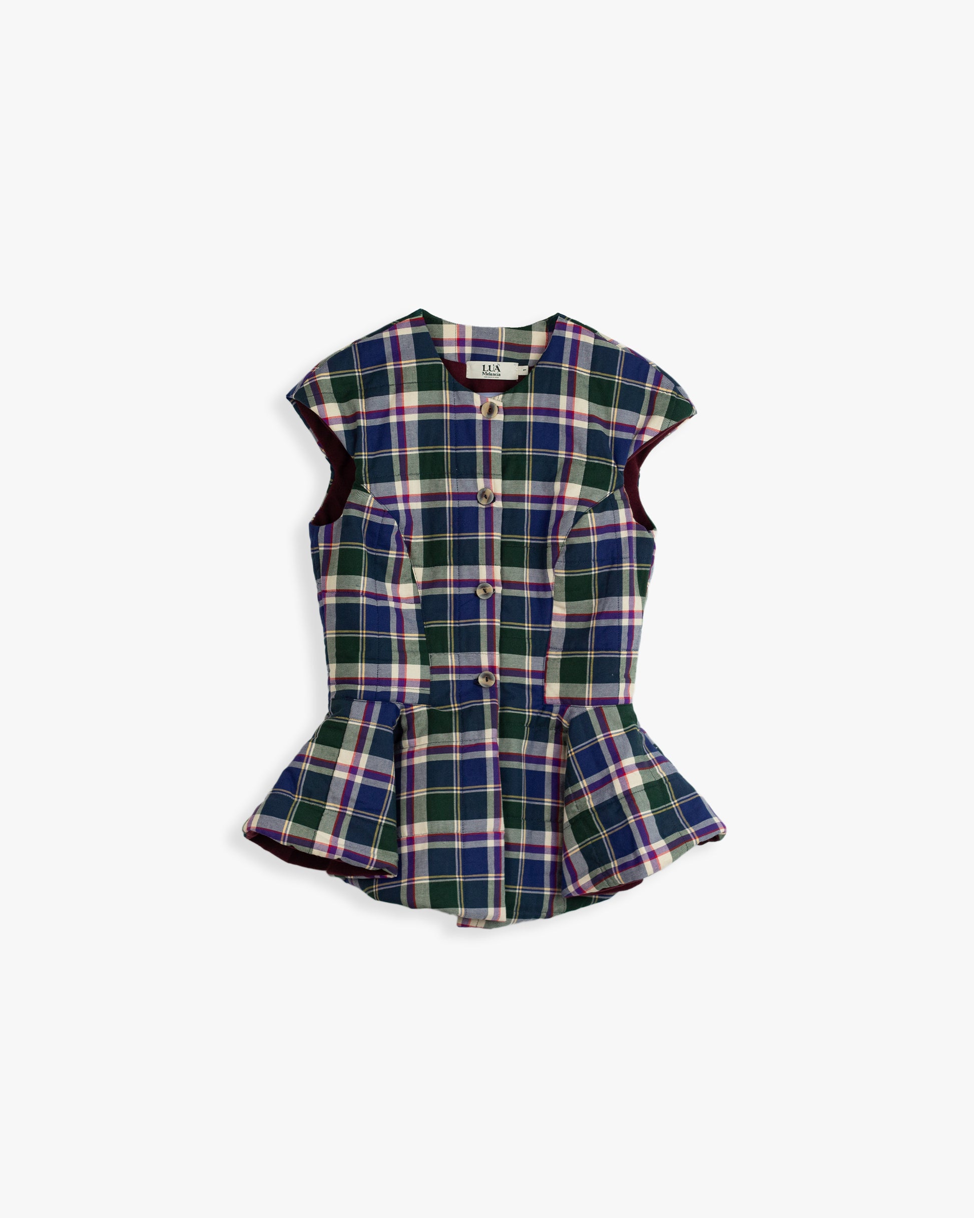 Colete de decote redondo e capuz amovível. Manga cava. Fecho frontal de botões na frente. Detalhe de folho em evasé. Colete forrado.