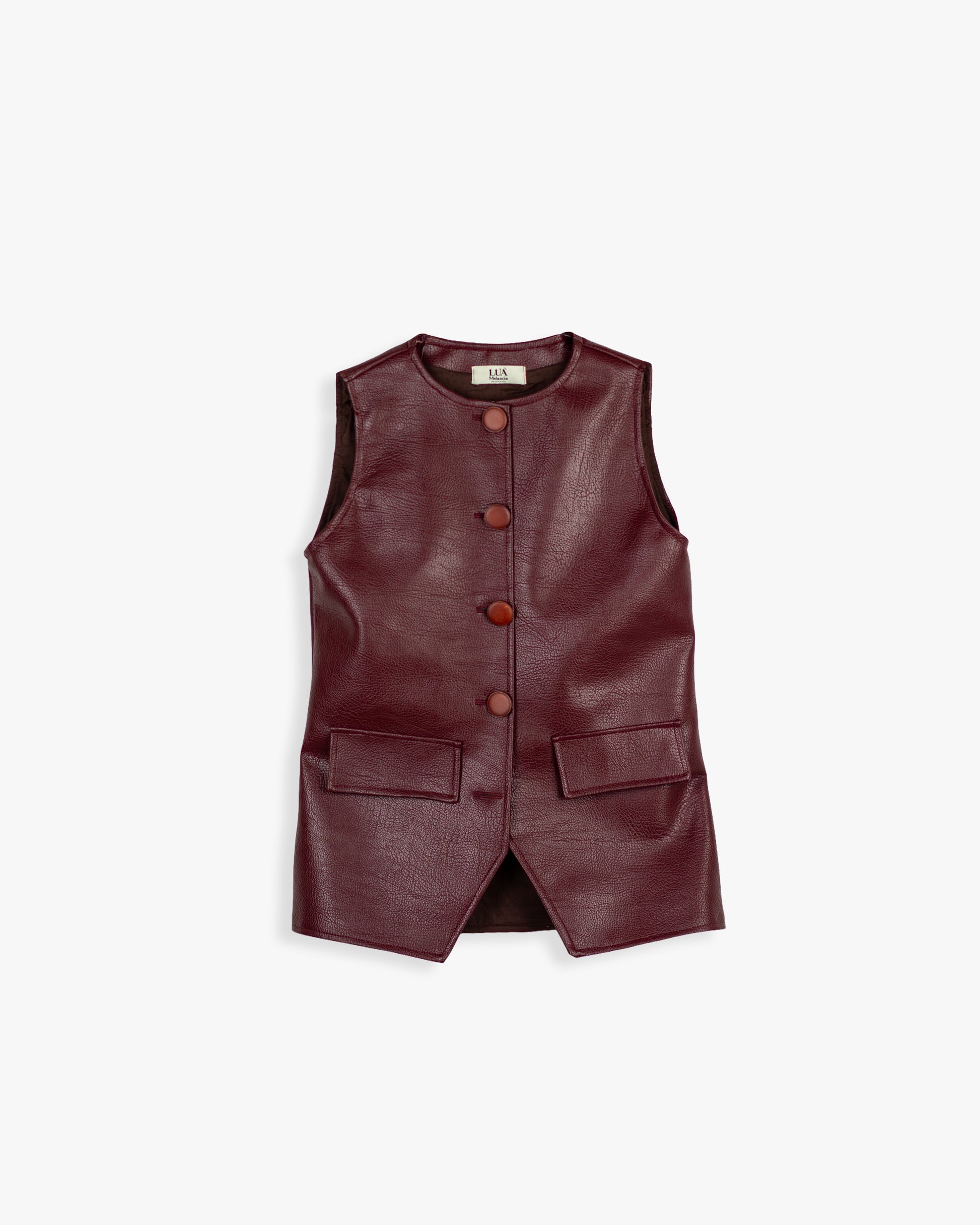Colete de decote redondo e manga cava. Pormenor de palas na frente. Fecho frontal com botão ao tom. Colete forrado.