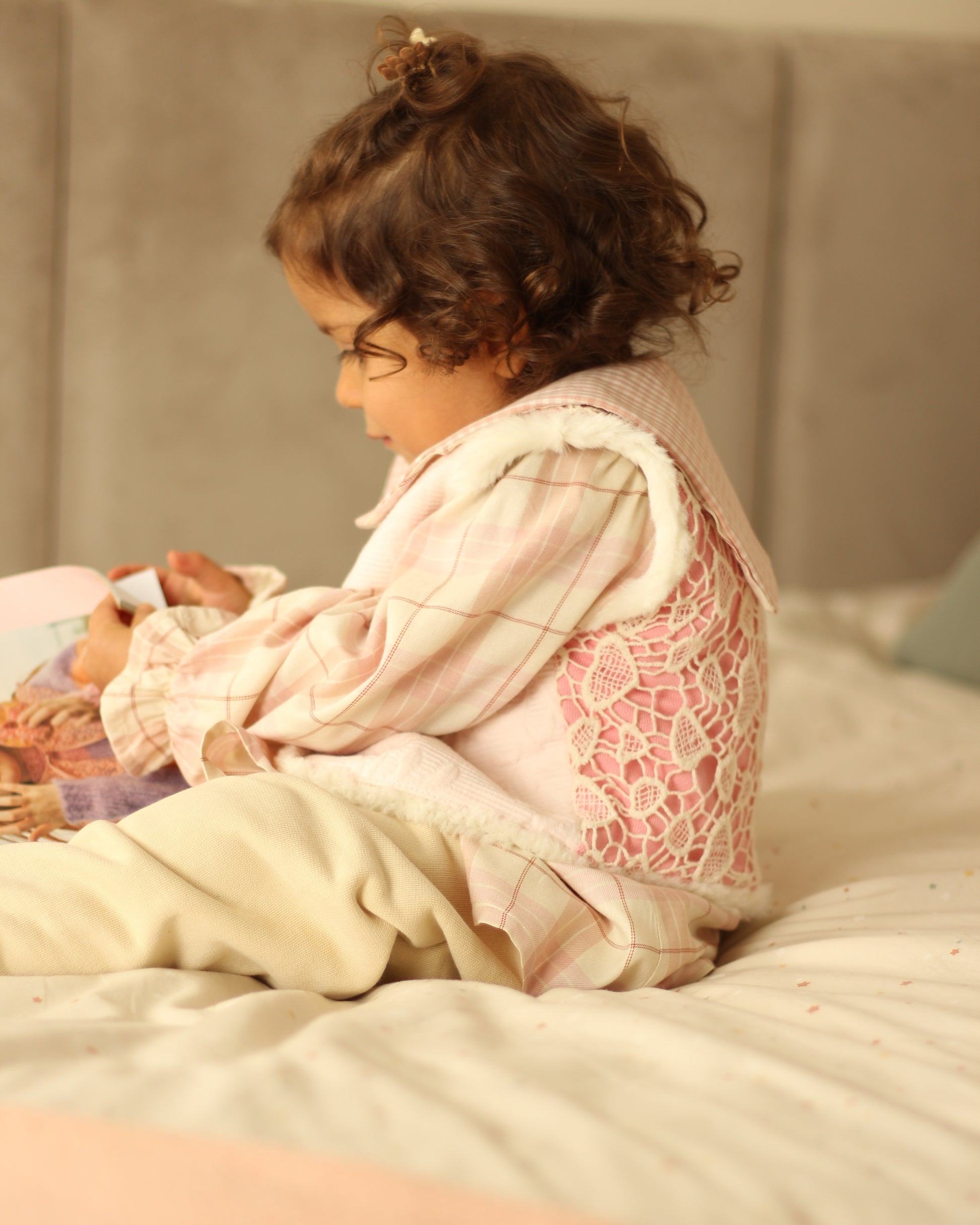 Colete com decote em V e manga cava. Colete em pelo reversível. Pormenor de costas em renda.