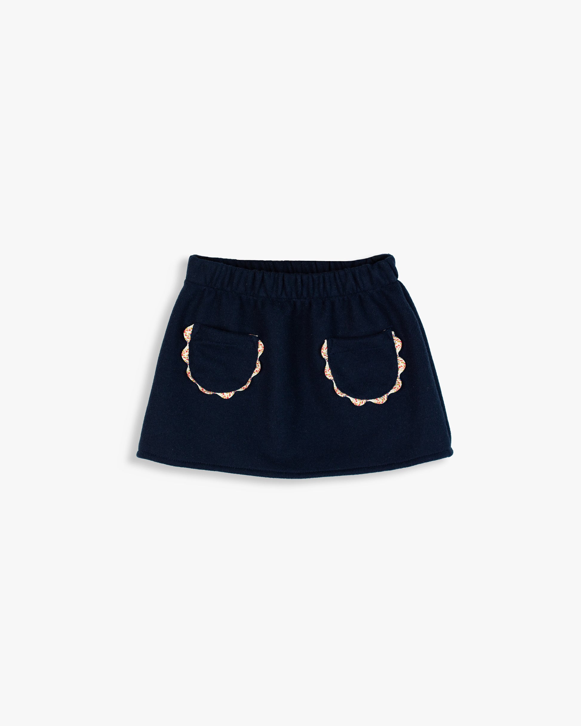 Saia de malha com cos elástico. Bolsos com aplicação ondulada em contraste.