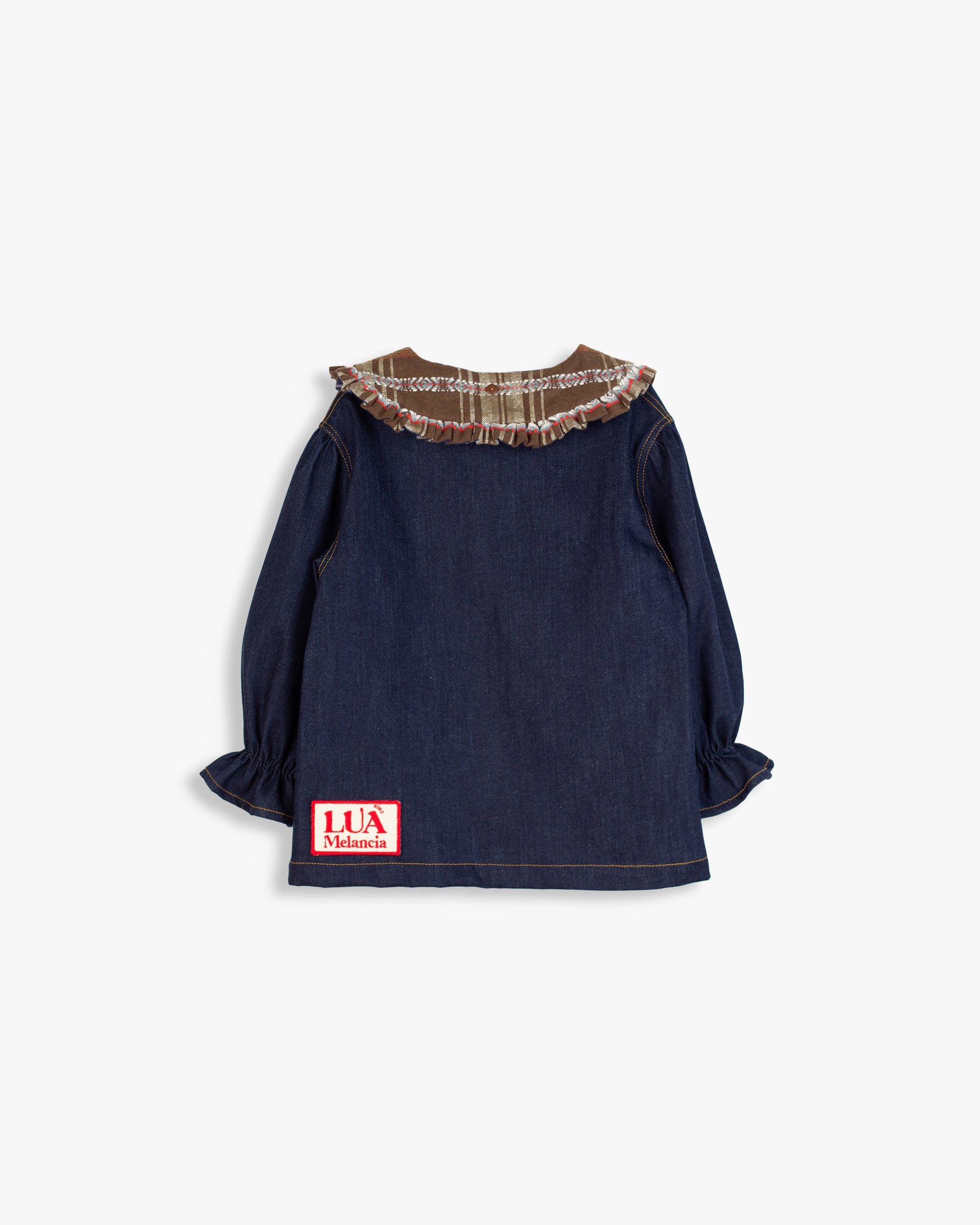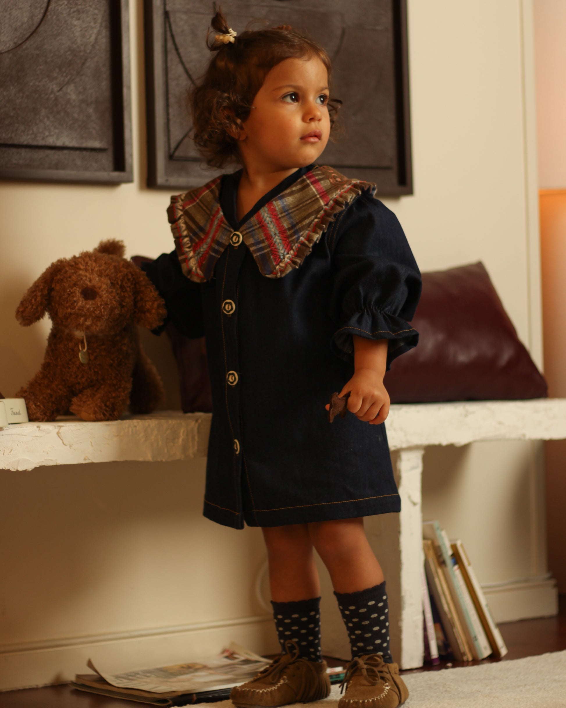 Vestido/Camisa de ganga, decote em V, manga comprida abalonada com punho elástico que termina em folho. Fecho de botão na frente.